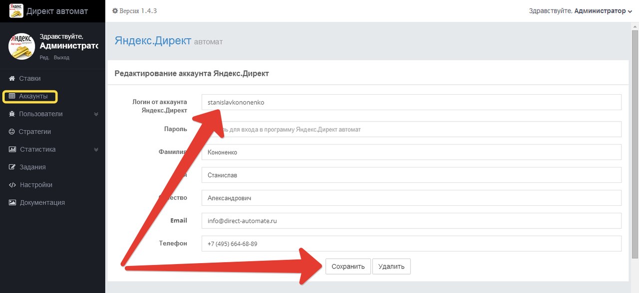 5) Зайдите в программу под логином "admin" и паролем "admin" по умолчанию. Перейдите на страницу Аккаунты и добавьте один или несколько аккаунтов Яндекс.Директ.