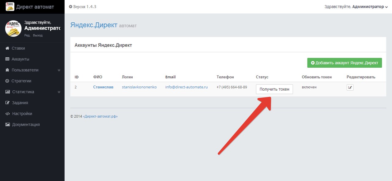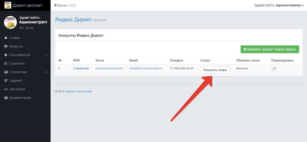 5.2 На странице со списком аккаунтов нажмите кнопку "Получить токен" напротив нужного аккаунта. Предварительно авторизуйтесь в Яндекс.Директ (или почте) под этим аккаунтом.