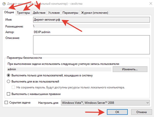 В закладке "Общие" вбейте любое название задачи, например "Директ автомат".
