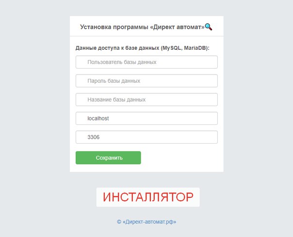 3. Запустите инсталлятор в веб-браузере, открыв ссылку на ваш сайт вида: http://ссылка-на-ваш-сайт.рф/direct/install.php (Если install.php не открывается и вы устанавливаете программу в подпапку вашего сайта "direct/" и в корневой папке вашего сайта имеется .htaccess с включенной директивой "RewriteEngine ON", то в него после нее необходимо прописать директиву: "RewriteRule ^direct/ - [L]".)