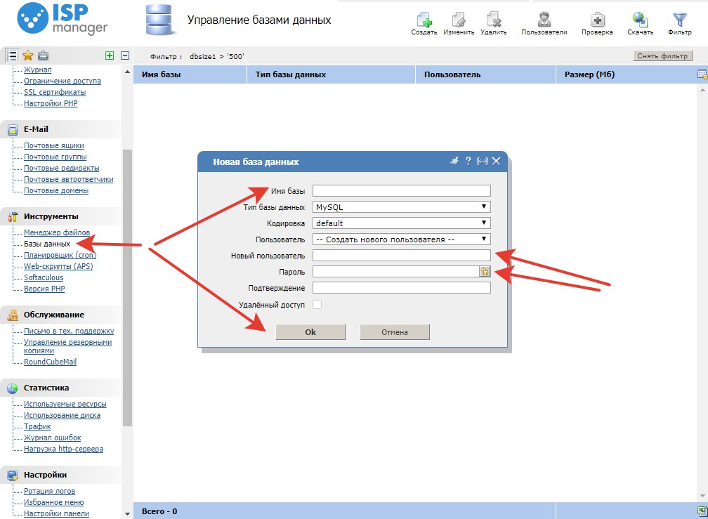 5. В панели управления хостингом создайте базу данных или используйте данные для доступа в существующую базу данных и впишите данные в окне инсталлятора.