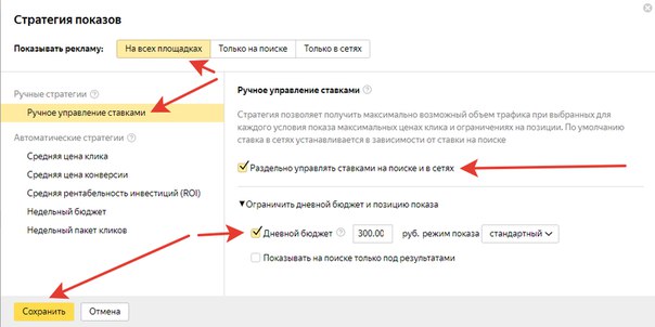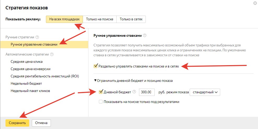 - В пункте "Стратегия" настроек кампании необходимо выбрать "Ручное управление ставками".