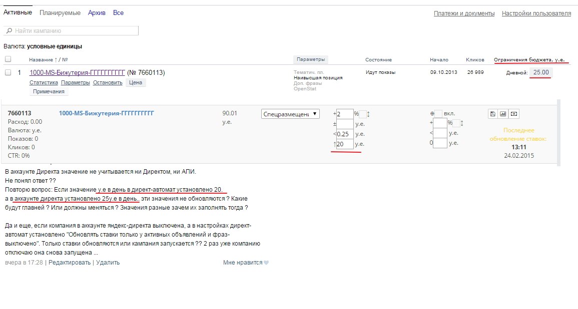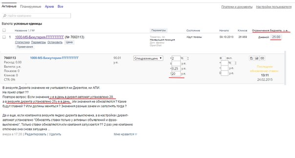 А еще вопрос если значение у.е в день установлено 20 к примеру, а в аккаунте директа стоит 25.. эти значения не обновляются как ставки ? Какие будут главней ? Или должны меняться ?