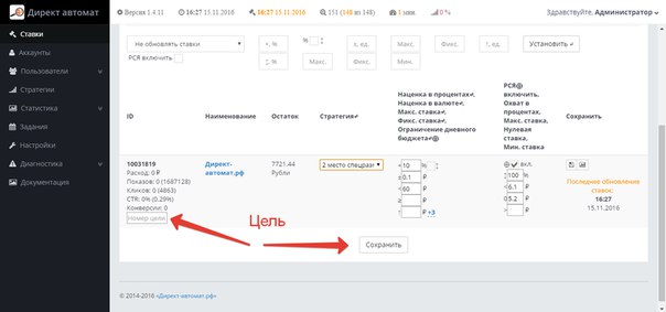 3. Добавлена возможность задать номер цели для каждой кампании, по которой получать конверсии по фразам в разделе «Ставки». По умолчанию конверсии получаются суммарно по всем целям определенным в метрике. Счетчик метрики задается в параметрах кампании в интерфейсе Яндекс.Директ.