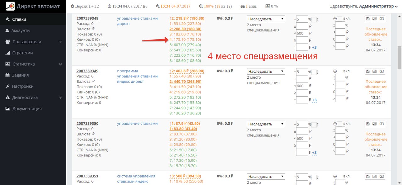 3. В формулы своих стратегий добавлены новые переменные "bid4" и "cost4", отвечающих за ставку и списываемую цену за 4 место спецразмещения соответственно.